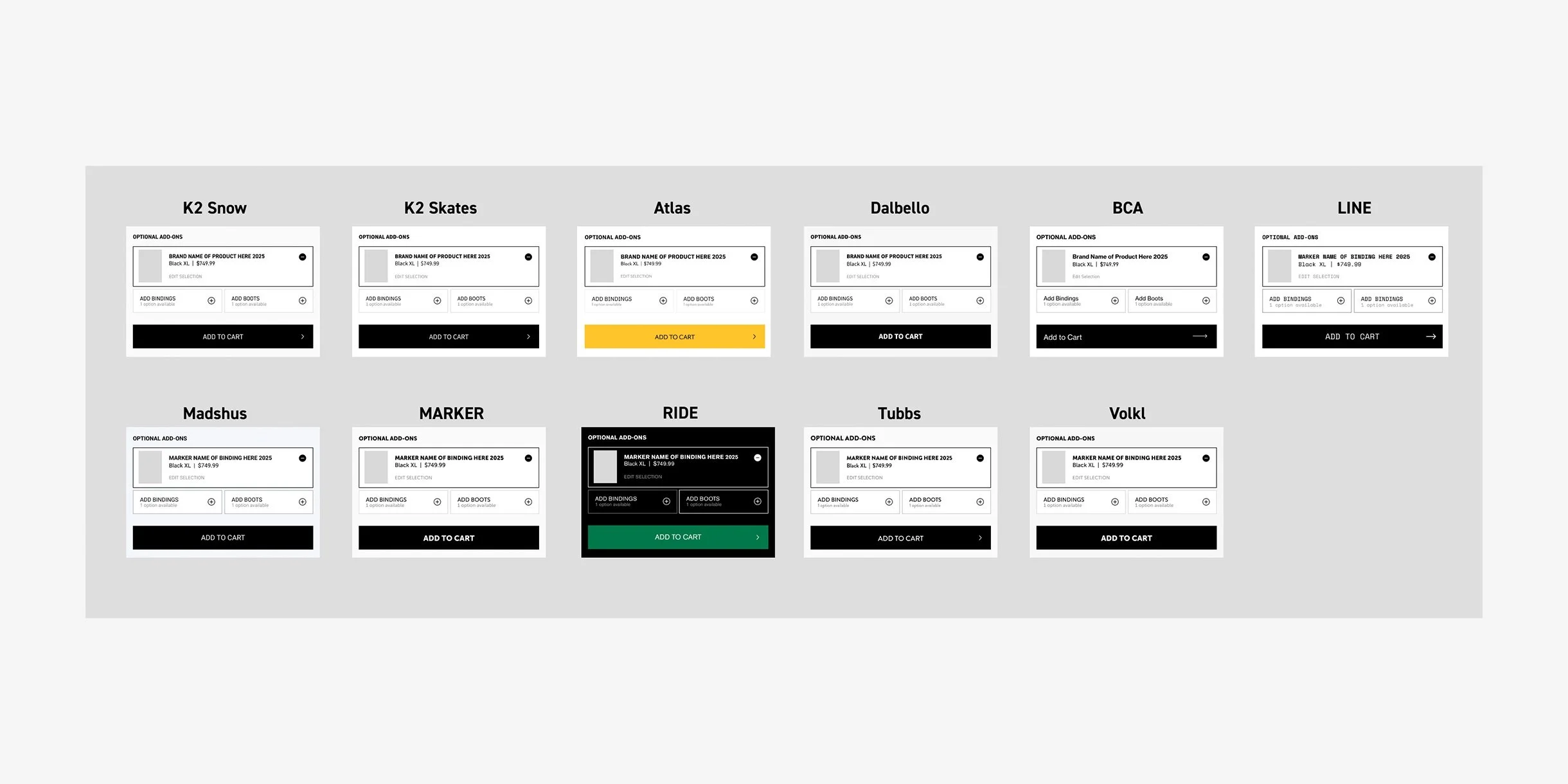 Inconsistent behavior: Each brand handled add-ons differently, no shared logic or UX pattern: Compatible products, packages, deals/promos, swag add-ons, bags for carrying, etc.