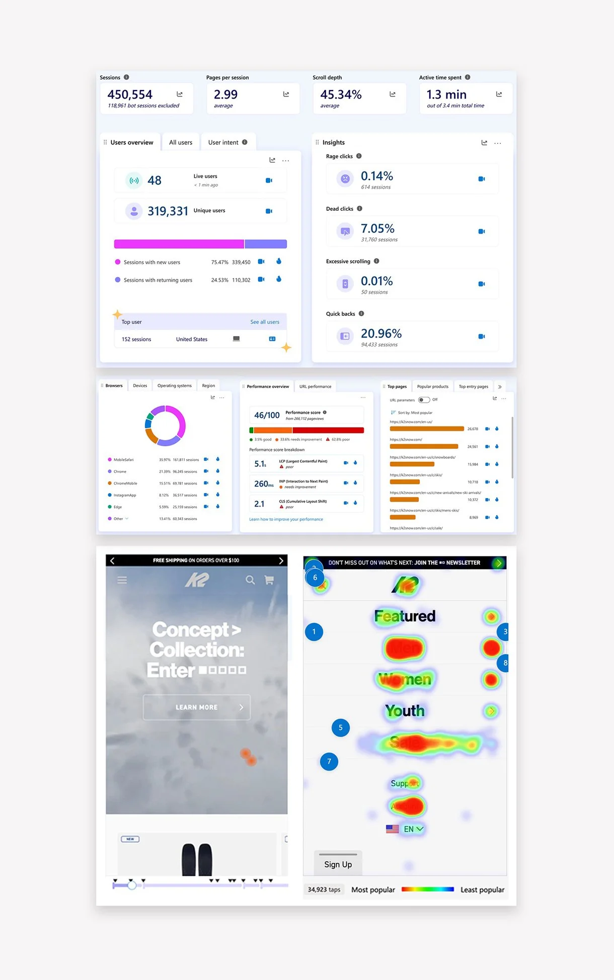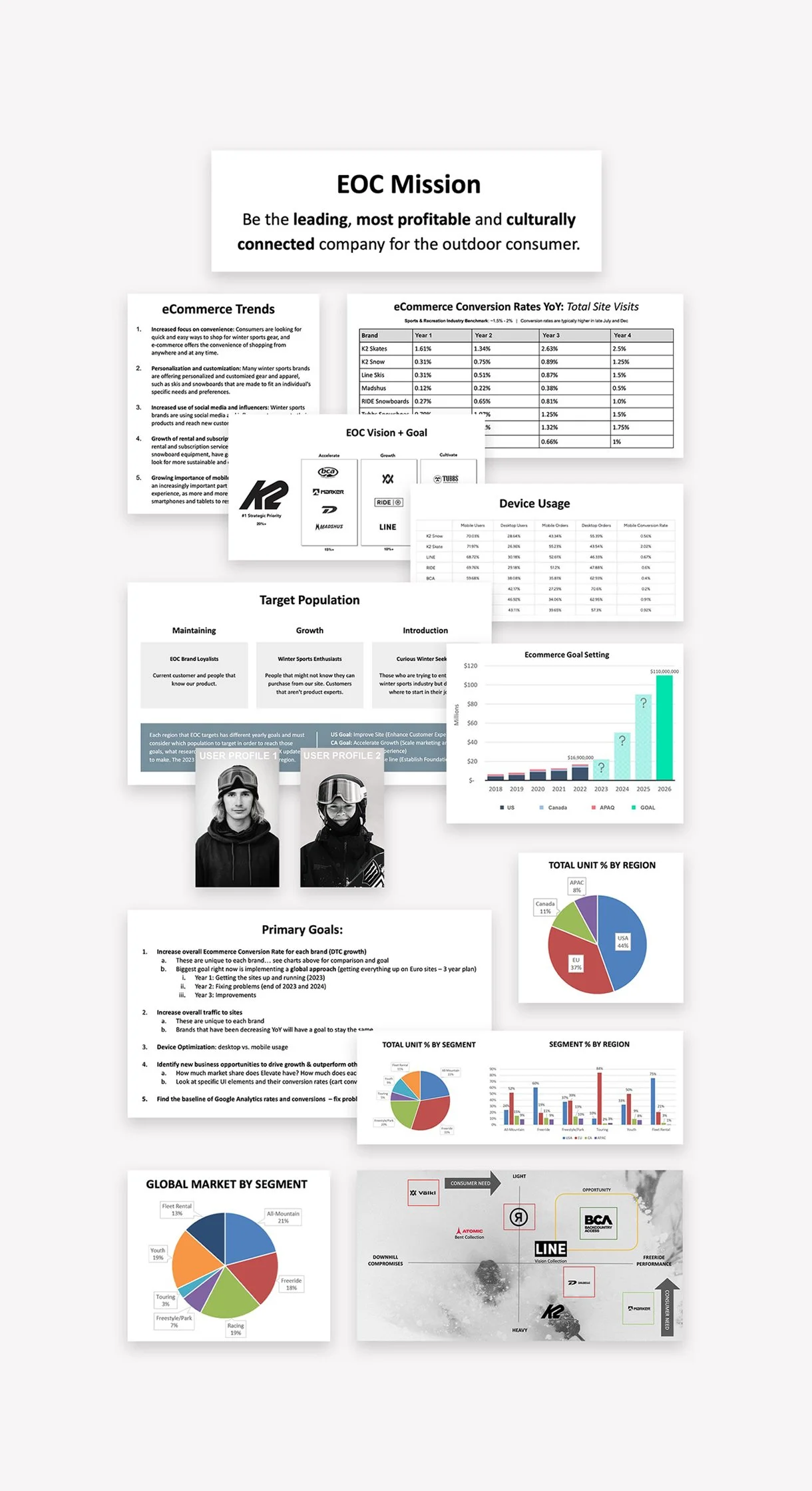 To understand the full scope, I conducted a platform and user audit across all 13 brand sites. We analyzed brand touchpoints, product journeys, and customer behavior across regions. I also dug into the product data. Not just digital assets, but details about the physical products themselves: skis, boots, airbags, snowshoes, and more. I explored who each product served, what specs customers expected from in-store experiences, and how we could translate that depth into a digital UX that could redefine the outdoor retail experience.
